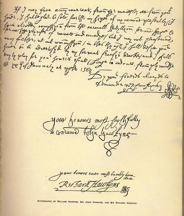 The signatures of William, Sir John and Sir Richard Hawkins.